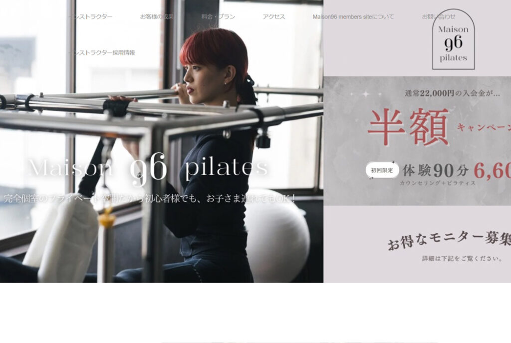 | 料金(一例) | 入会金 ¥10,000 体験加圧ピラティス ¥3,000 月額コース 4回 ¥12,000 |